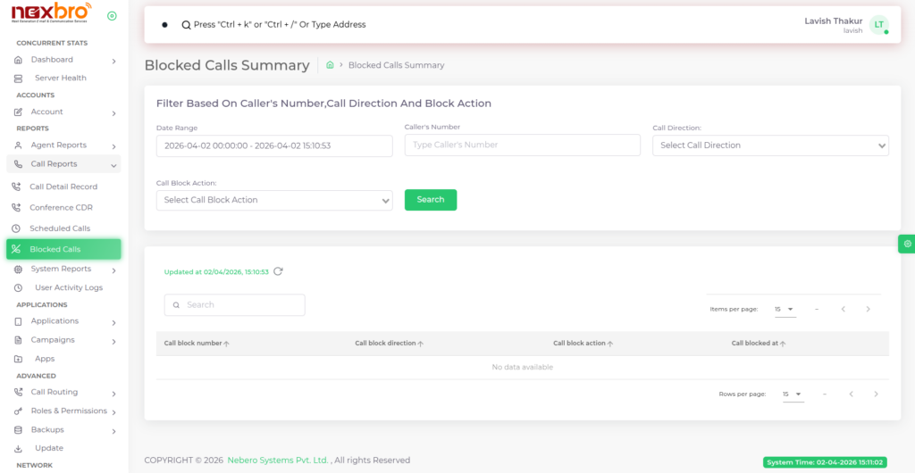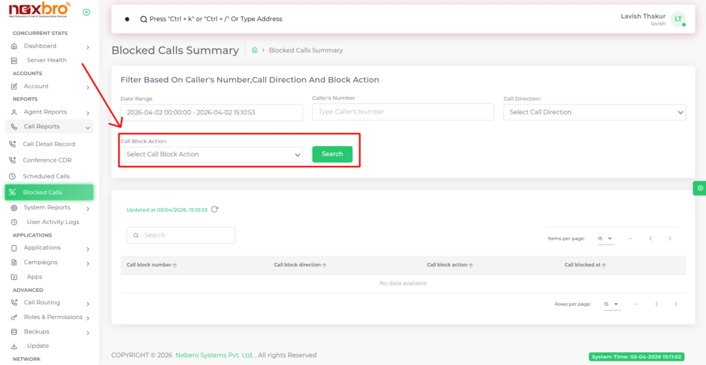 Allows users to filter blocked call records based on specific block actions applied (e.g., rejected, dropped). It helps in analyzing how calls are being handled and ensures better control over call blocking rules and policies.