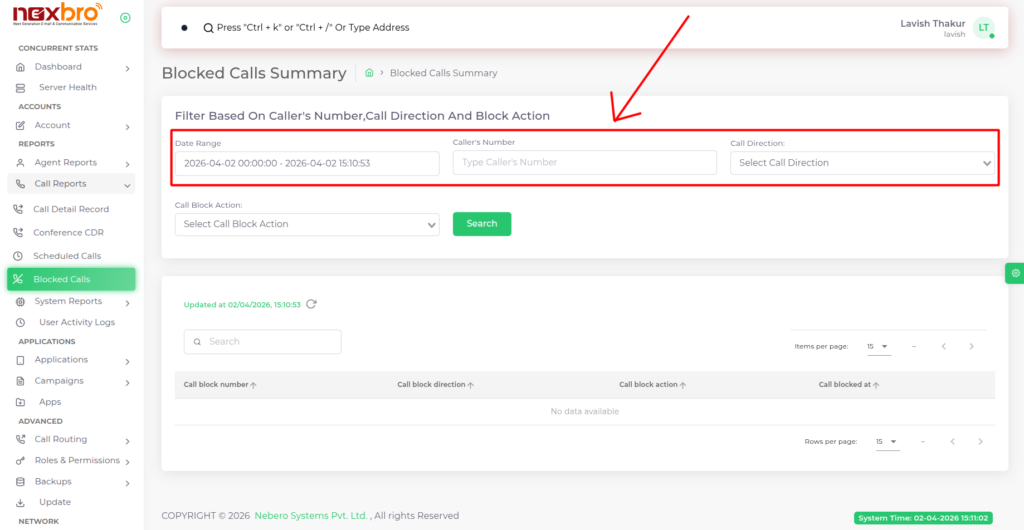 Provides options to filter blocked call records based on date range, caller’s number, and call direction. This helps users quickly identify and analyze specific blocked calls for better monitoring and control.