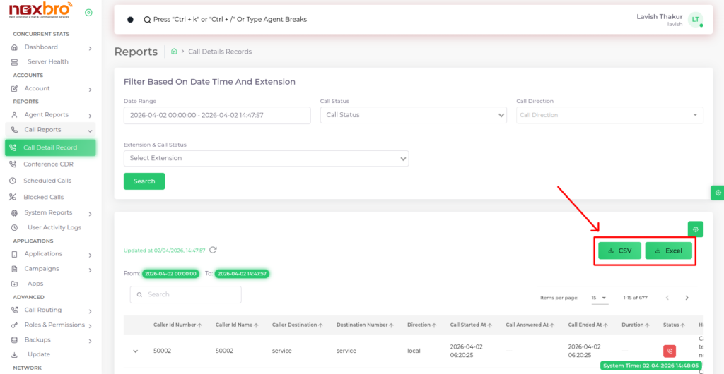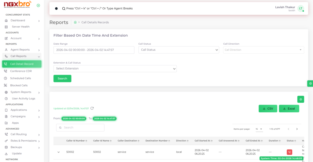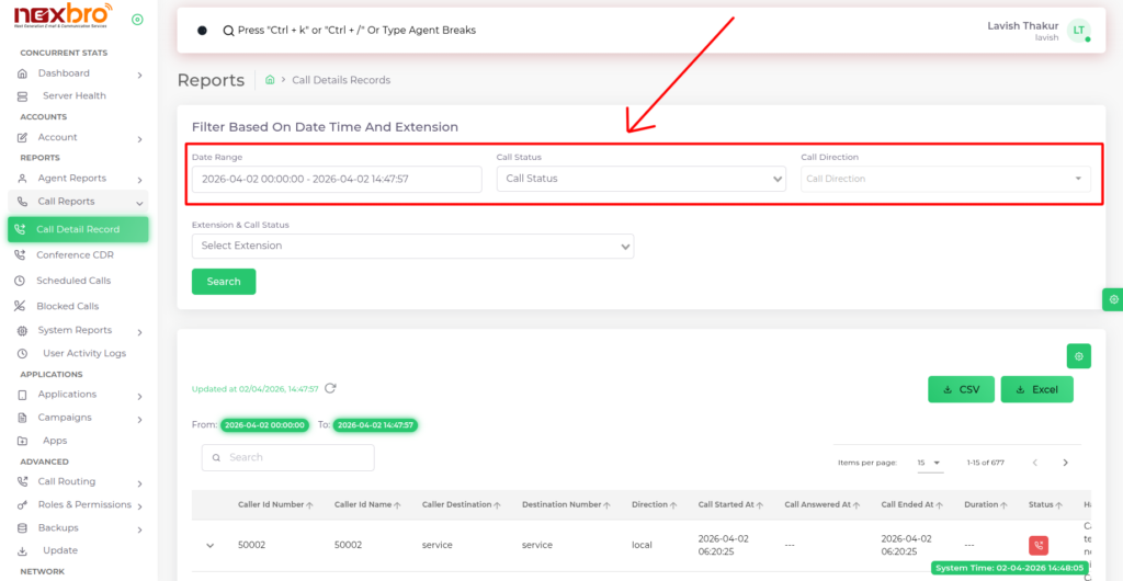 Provides options to filter call records based on date range, call status, and call direction.