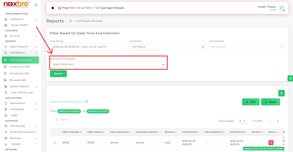 Allows users to filter call records based on specific extensions and their corresponding call status.