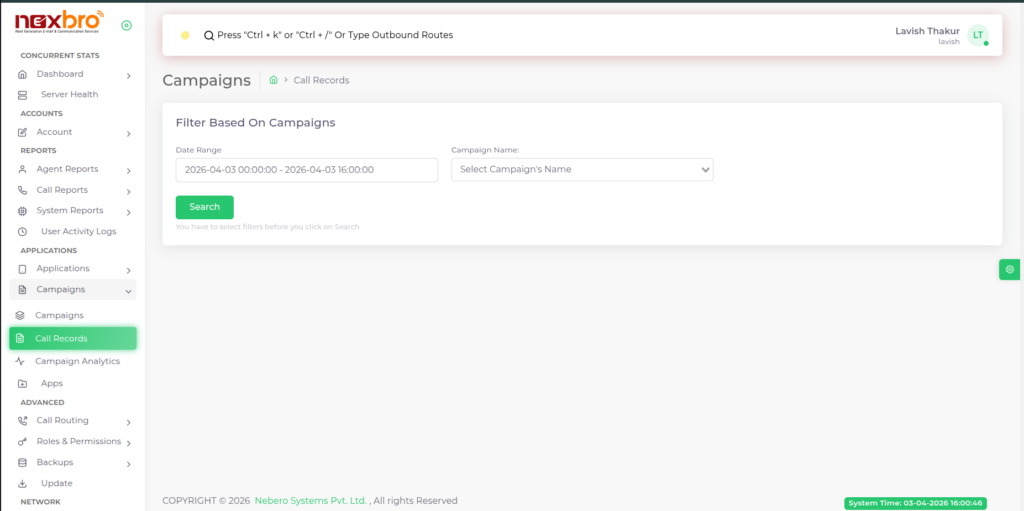This screen allows you to view call records based on selected campaigns using filters. You can specify conditions and retrieve relevant call data for analysis. The search option helps generate filtered results quickly. It is mainly used for tracking and reviewing campaign performance.