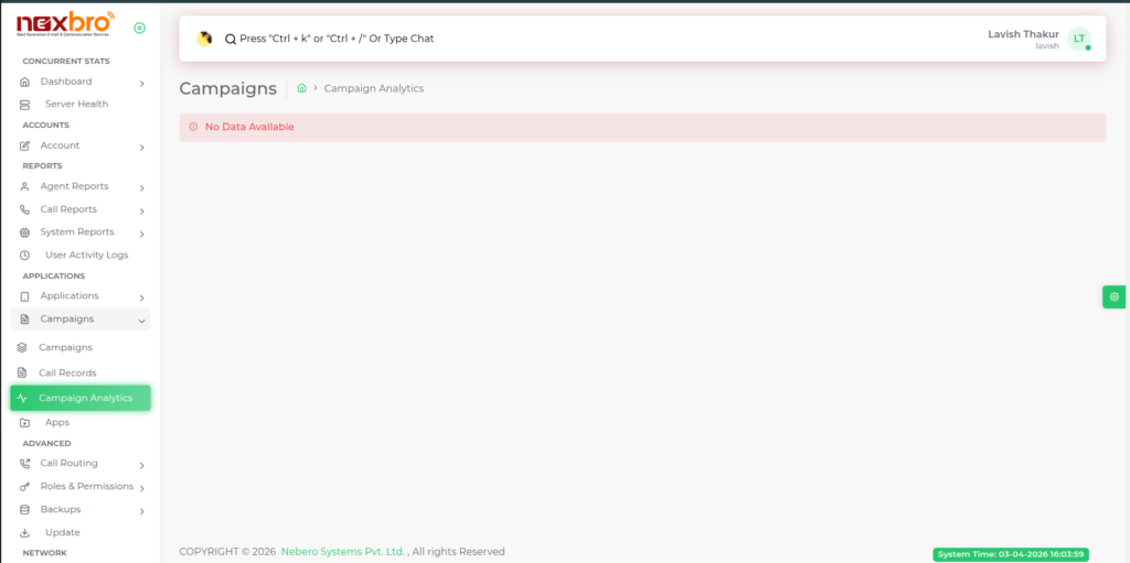 This screen displays analytics and performance insights for campaigns. It helps in monitoring metrics and evaluating campaign effectiveness. Currently, no data is available, indicating that no campaign activity or records have been generated yet. Once campaigns are active, analytics data will be shown here for tracking and decision-making.