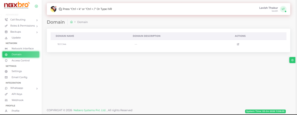 The Domain module allows the admin to manage domain settings within the IP-PBX system. A domain represents a logical grouping of users, extensions, and configurations, typically associated with a specific IP address or network.