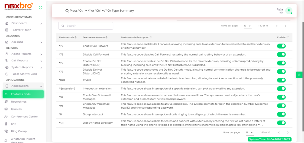 Feature codes are short dial codes that enable users to quickly access system functionalities such as call forwarding, voicemail, Do Not Disturb (DND), and more.