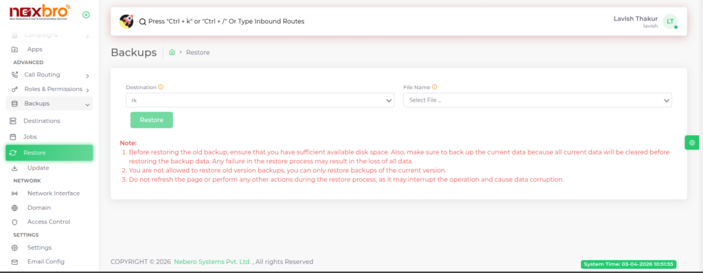 The Restore module allows the admin to restore previously created backups of the IP-PBX system. This feature is used to recover system data, configurations, and settings from a selected backup destination.