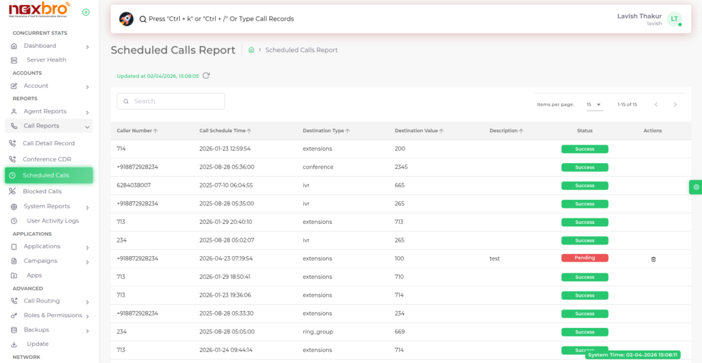Provides details of all scheduled calls, including timing, participants, and execution status. It helps users track planned communications, monitor whether calls were completed as scheduled, and manage future call planning effectively.