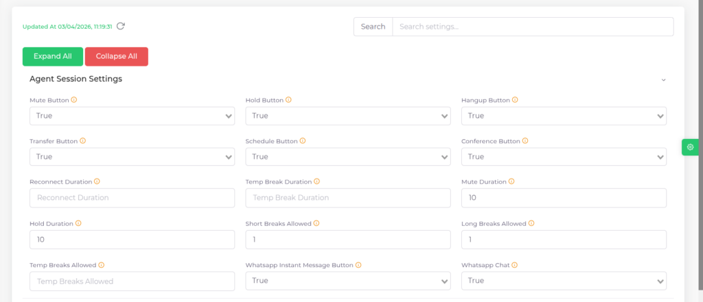 | Whatsapp Chat | Visibility of WhatsApp Instant Message button in session. If disabled, the agent will not be able to send predefined WhatsApp messages to the caller. |