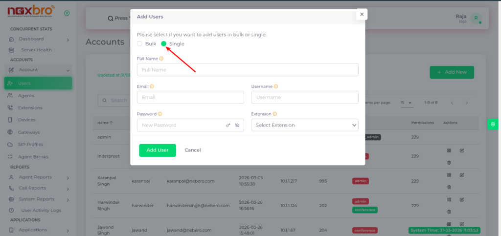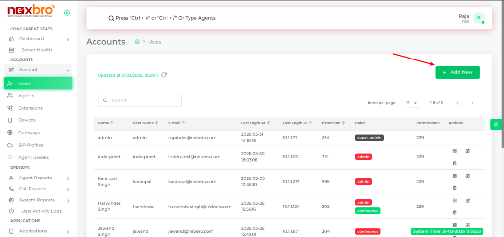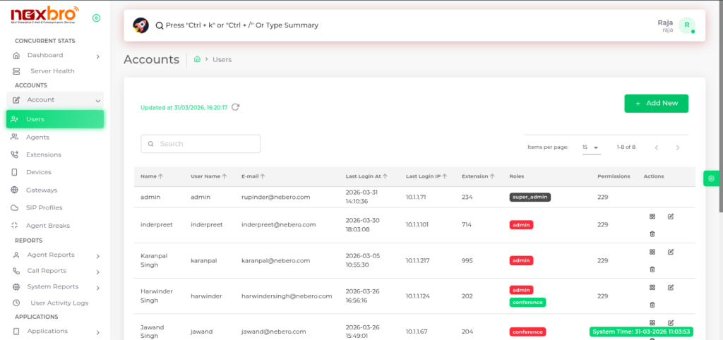 The Users module allows the admin to create and manage user accounts within the IP-PBX system. These users are responsible for accessing the system based on assigned roles and permissions.